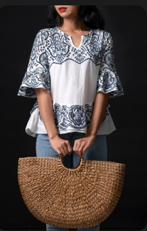 A chic white short frock adorned with delicate blue embroidery, crafted for timeless elegance.